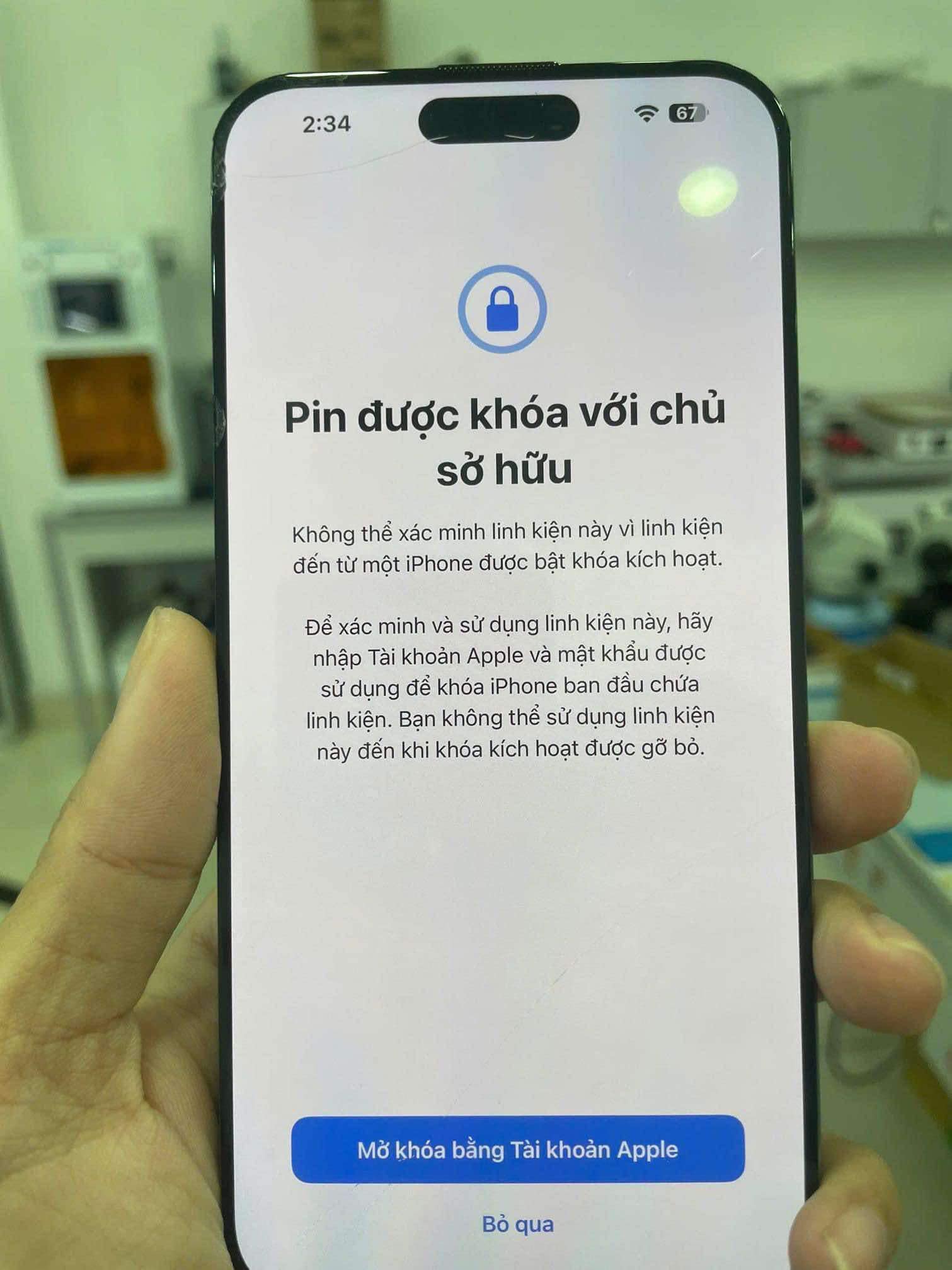 Nếu linh kiện thuộc về một máy iPhone bị khóa iCloud, người dùng sẽ cần nhập tài khoản Apple ID và mật khẩu của chiếc iPhone đó. Nếu không nhập được, linh kiện sẽ vẫn hoạt động nhưng bị báo "linh kiện không xác định" trong phần Cài đặt.