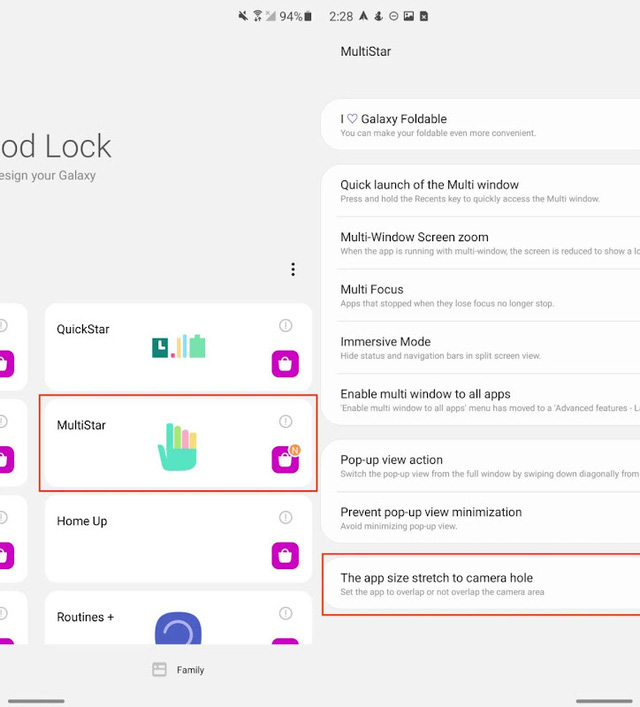 Để ứng dụng có thể mở toàn màn hình để tận dụng được thế mạnh màn hình lớn từ Galaxy Z Fold3, bạn hãy tải thêm ứng dụng Good Lock từ Play Store. Trong ứng dụng này, bạn chọn mục MultiStar, tìm tới ứng dụng DrasStic và nhấn "Overlap with the camera area" để ứng dụng tràn qua lỗ cắt camera Infinity-O của máy.