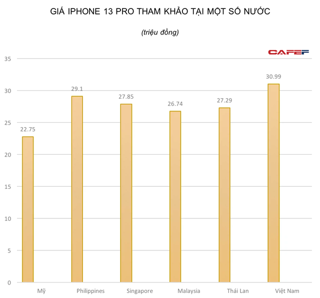 Tại Philippines, mức giá này thấp nhất vào khoảng 29,1 triệu đồng; tại Singapore là vào khoảng 27,85 triệu đồng; ở Malaysia giá bắt đầu từ 26,74 triệu đồng, và ở Thái Lan giá của iPhone 13 Pro bắt đầu từ 27,29 triệu đồng.