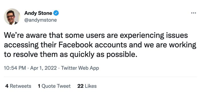 “Chúng tôi đã biết chuyện một số người dùng Facebook đang gặp vấn đề về việc bị khóa tài khoản và chúng tôi đang nỗ lực giải quyết sự việc nhanh nhất có thể”, ông Andy Stone, người đại diện của Facebook viết trên Twitter.