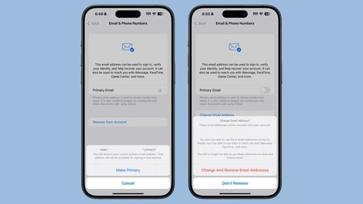 Để thực hiện thay đổi, người dùng chỉ cần vào ứng dụng Cài đặt, chọn vào tên tài khoản > chọn "Đăng nhập & Bảo mật", sau đó chọn địa chỉ email cần thay đổi và nhấn nút "Thay đổi địa chỉ email".