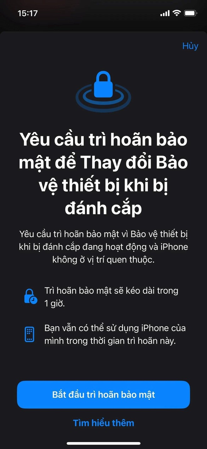 Tính năng Bảo vệ thiết bị khi bị đánh cắp sẽ bổ sung một lớp bảo mật khi iPhone của bạn ở xa các vị trí quen thuộc, chẳng hạn như nhà hoặc cơ quan và giúp bảo vệ tài khoản và thông tin cá nhân trong trường hợp iPhone của bạn bị đánh cắp.