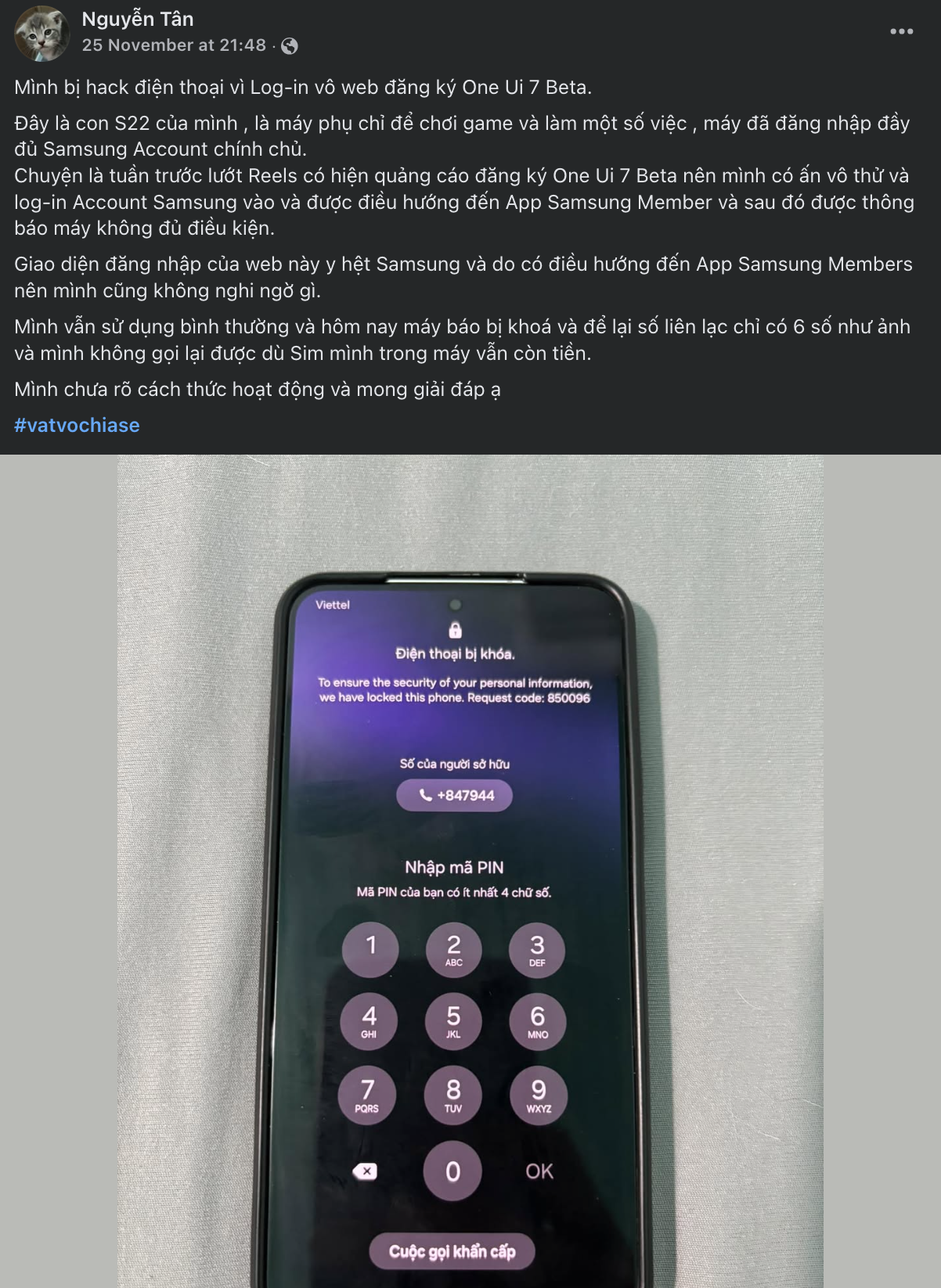 Những ngày qua, nhiều người dùng trên các hội nhóm công nghệ tại Việt Nam, trong đó đặc biệt là cộng đồng người dùng Samsung, đã phán ánh tình trạng điện thoại của mình bị khóa và không thể sử dụng. Nguyên nhân cụ thể chưa được xác định, nhưng phần lớn người dùng bị khóa cho biết trước đó đã truy cập vào một đường link nhằm đăng ký chương trình trải nghiệm bản cập nhật phần mềm One UI 7 của Samsung.