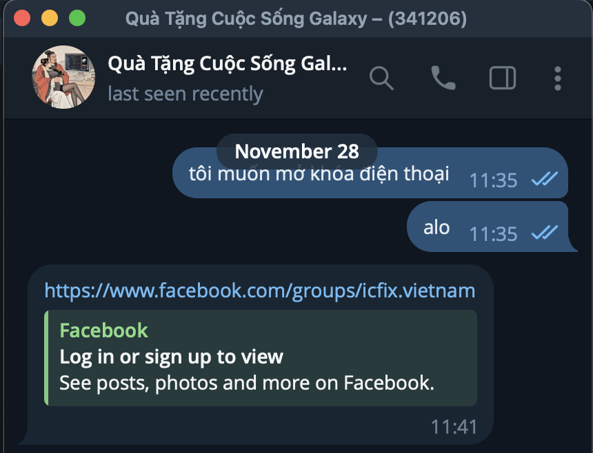 Thực tế, khi thử liên hệ với một tài khoản Telegram được để lại dưới dạng tin nhắn báo mất của một chiếc điện thoại Samsung bị khóa, tất cả những gì chúng tôi nhận lại là một đường link tới nhóm "ICFix Team Chợ". Ngoài đường link trên, tài khoản Telegram này không phản hồi bất cứ tin nhắn nào khác của chúng tôi.