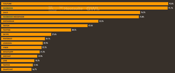 Nếu tính riêng tại Việt Nam, có tới 91,7% số người dùng Internet sử dụng Facebook. Con số này là 75.8% với người sử dụng Messenger và 53,5% người sử dụng Instagram. Trong top 15 ứng dụng phổ biến nhất Việt Nam năm 2021, Zalo là ứng dụng Việt Nam duy nhất được nhắc đến.