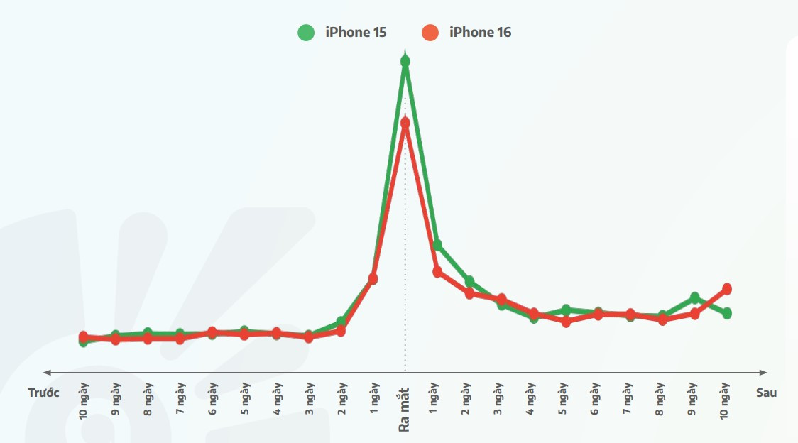 Những ngày trước và sau thời điểm đó, trung bình lượng tìm kiếm về từ khóa “iPhone 15” theo ngày cũng cao hơn so với từ khóa “iPhone 16”.