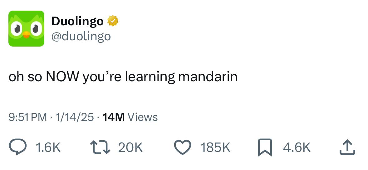 Không bỏ lỡ cơ hội, Duolingo tận dụng tình huống để quảng bá dịch vụ của mình một cách sáng tạo. Trên mạng xã hội X, ứng dụng này đăng dòng trạng thái hài hước: "Ồ, bây giờ thì các bạn mới học tiếng Quan Thoại à?"