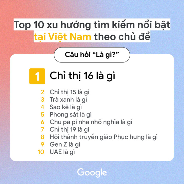 Đáng chú ý, câu hỏi "Gen Z là gì?" cũng nằm trong top tìm kiếm của năm với nhiều thuật ngữ và trào lưu mới ra đời mỗi ngày, nhiều người dùng đã phải trông cậy vào Google để không bị lạc hậu, điển hình như câu "Chu pa pi nha nhố nghĩa là gì?".