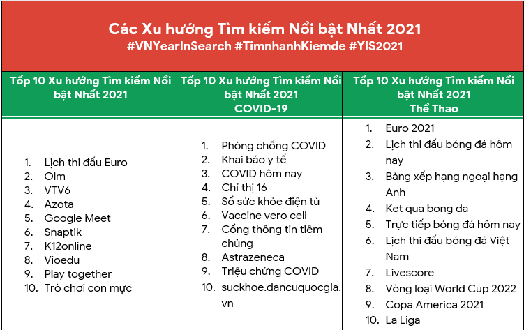 Về Covid-19, Google có một bảng xếp hạng riêng các từ khóa phổ biến thuộc lĩnh vực này. Người Việt tìm nhiều nhất về chỉ thị 15, 16 và 19 để thực hiện giãn cách xã hội; hỏi cách "test PCR như thế nào"; hay "xét nghiệm Covid ở đâu", "khai báo y tế ở đâu’; hoặc "Hội thánh truyền giáo Phục Hưng là gì".