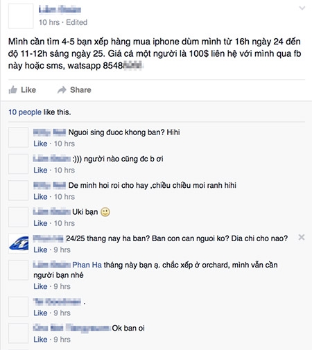 "Hiện tại, mình cần tuyển 6-8 người xếp hàng mua iPhone, thời gian xếp hàng từ 2 giờ chiều hôm trước cho đến lúc mua iPhone của ngày hôm sau. 6 USD/giờ bao ăn bữa tối và sáng", một dân buôn hiện sống ở Hà Nội, đăng tin rao vặt lên một nhóm chợ Việt Nam ở Singapore.