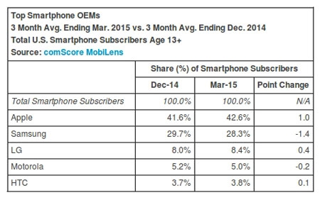 Xét trên tiêu chí của từng nhà sản xuất, Apple tiếp tục có một quý khởi đầu thành công tại Mỹ khi thị phần tăng lên 42,6%. Trong khi đó đối thủ xếp ngay sau "quả táo" là Samsung lại giảm từ 29,7% quý cuối năm 2014 xuống còn 28,3%.