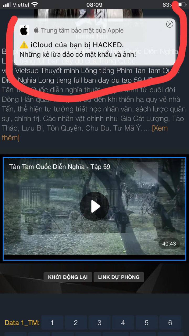 Cụ thể, trên một fanpage, người dùng chụp lại hình ảnh màn hình nhận được thông báo "iCloud của bạn đã bị hack". Thông báo này được hiển thị khi người dùng sử dụng trình duyệt web Safari hoặc Google Chorme trên điện thoại để thực hiện các thao tác xem phim trên các website.