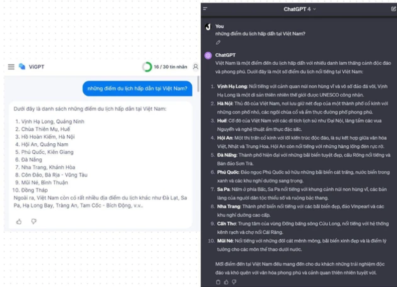 Bà Lê Thị Quyên (quận Bình Thạnh, TP HCM) cho hay sau khi đặt câu hỏi về lịch sử, văn hóa, danh nhân, đặc trưng vùng miền của Việt Nam với ViGPT, kết quả bà nhận được vô cùng ấn tượng. "Tuy chưa hoàn hảo nhưng ViGPT đã đem đến những thông tin rất chính xác" - bà nhận xét.