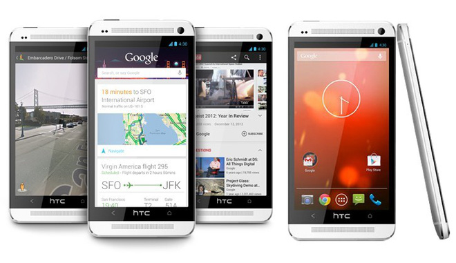 HTC One Google Play Edition cũng xuất hiện vào năm 2013 và thay thế giao diện Sense UI với Android gốc. Cửa hàng Google Play ban đầu tính giá 600 USD cho một chiếc, nhưng đã giảm xuống còn 500 USD vào năm sau. Dù vậy, giá khởi điểm lại cao hơn phiên bản thông thường, với giá 575 USD ở Mỹ.
