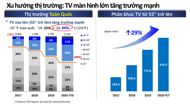 Số liệu của GfK cho thấy từ năm 2017 đến nay, thị phần TV màn hình lớn từ 55 inch trở lên là phân khúc duy nhất tăng trưởng mạnh. Trong khi thị phần các phân khúc màn hình khác đều sụt giảm, thị phần TV màn hình từ 55 inch trở lên tăng từ 18% năm 2017 lên 44% trong năm 2020 và trở thành phân khúc có thị phần lớn nhất trên thị trường. Thậm chí năm 2020 còn đang chứng kiến tốc độ tăng trưởng bùng nổ của phân khúc này khi tăng thêm 11% thị phần.