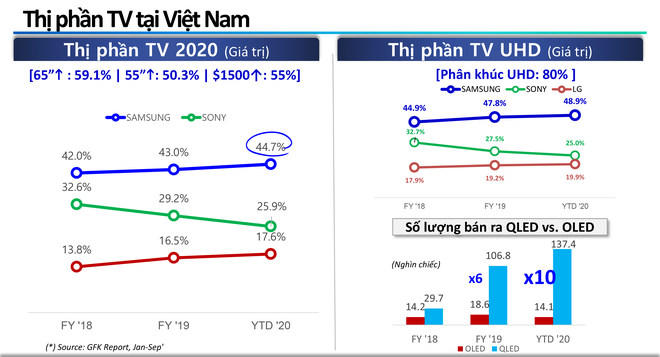 Không chỉ dẫn đầu về thị phần chung trên toàn thị trường, báo cáo của GfK cho thấy ngay cả với phân khúc TV độ phân giải cao UHD, Samsung cũng đang là người dẫn đầu. Thị phần của Samsung đối với thị trường TV UHD tăng từ mức 47,8% của năm 2019 lên 48,9% của năm 2020, lớn hơn cả tổng thị phần của Sony và LG trên thị trường này.