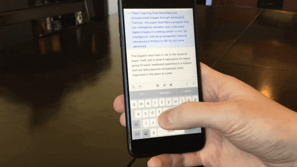 Khi nhập liệu nội dung trên IOS, người dùng có thể di chuyển nhanh con trỏ trên màn hình để quay lại chỉnh sửa bất kỳ chỗ nào. Chỉ cần giữ vào con trỏ trên màn hình thiết bị rồi kéo đến vị trí cần sửa.