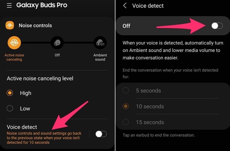 Bạn chỉ cần nhấn vào phần "Phát hiện giọng nói" để bật tính năng này và chọn khoảng thời gian bạn muốn tai nghe chờ sau khi nghe giọng nói của mình để trở lại mức âm lượng trước đó, đồng thời bật lại ANC. Bạn có thể chọn từ 5, 10 và 15 giây.