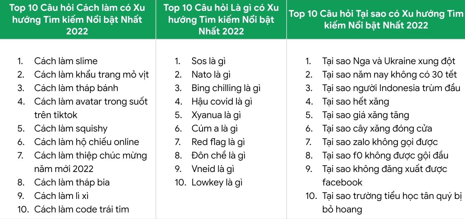 Về phía tin tức quốc tế, chủ đề thời sự được người Việt quan tâm nhất là cuộc xung đột tại Ukraine. Chủ đề này đứng đầu hạng mục các câu hỏi “Tại sao?”. Ngoài ra, chủ đề y tế với tình hình diễn biến của các dịch bệnh như “sốt xuất huyết” và “đậu mùa khỉ” cũng được người Việt nhắc đến nhiều trên công cụ tìm kiếm Google.