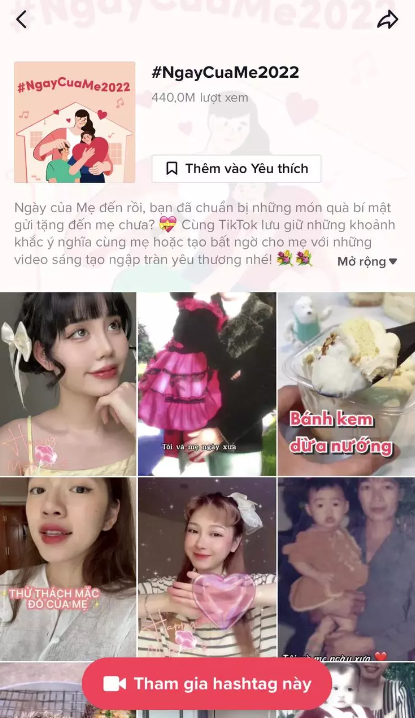 Hashtag #NgayCuaMe2022 là một xu hướng nổi bật trên TikTok trong tháng 5. Đây là một tập hợp những video ngắn có nội dung tri ân Ngày của mẹ (14/5).