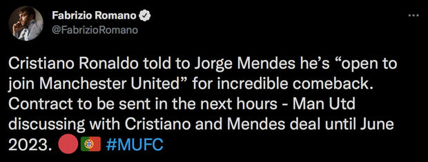 Ngoài ra, ông Quảng cũng sử dụng cụm từ quen thuộc "không thể tin được" khi trích dẫn câu nói của Fabrizio Romano, một nhà báo Ý nổi tiếng trong giới chuyển nhượng bóng đá, về sự trở lại của Ronaldo. Tuy nhiên, qua đối chiếu với đoạn tweet gốc, Fabrizio không hề sử dụng cụm từ này.
