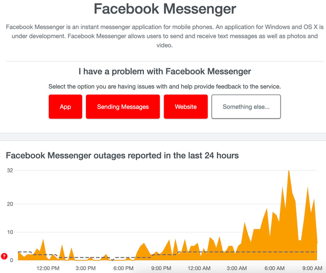 Trên DownDetector, công cụ chuyên theo dõi tình trạng hoạt động của các dịch vụ Internet, vấn đề của Messenger bắt đầu được ghi nhận từ 4h và tăng đột biến từ 8h. Đến hiện tại, người dùng trên khắp thế giới vẫn tiếp tục báo cáo về sự cố.