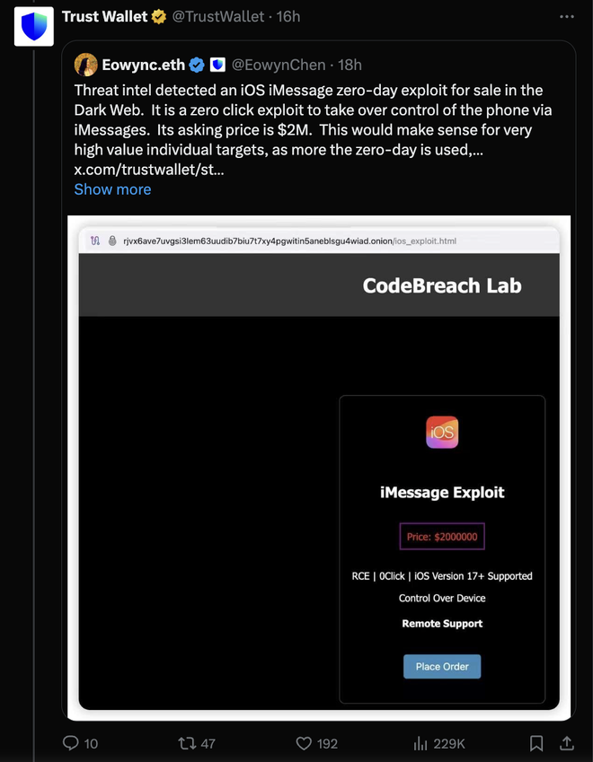 "Cảnh báo tới người dùng iPhone. Thông qua nguồn đáng tin cậy từ Dark Web, chúng tôi biết được một lỗ hổng zero-day rủi ro cao, nhắm vào iMessage", nội dung bài đăng trên nền tảng X do tài khoản Trust Wallet đăng tải cho biết.