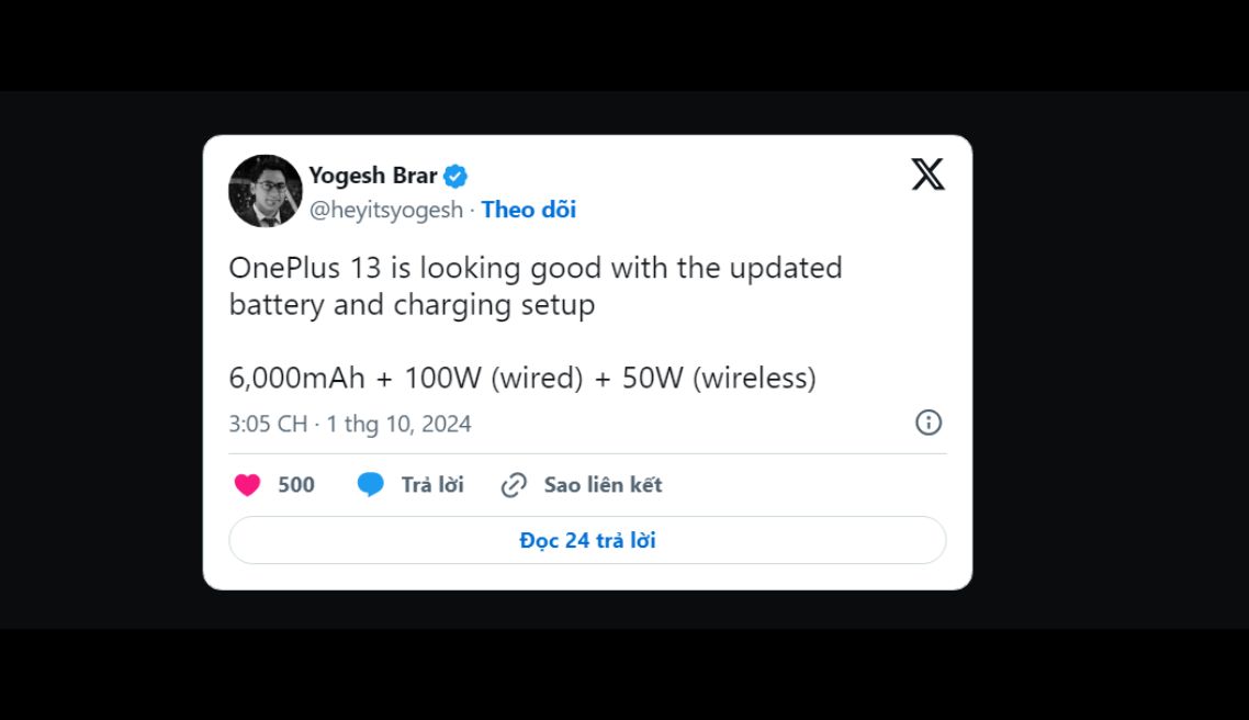 Mới đây leaker Yogesh Brar đăng tải trên Twitter dòng trạng thái cho thấy OnePlus 13 sẽ có viên pin dung lượng lớn lên tới 6.000mAh.