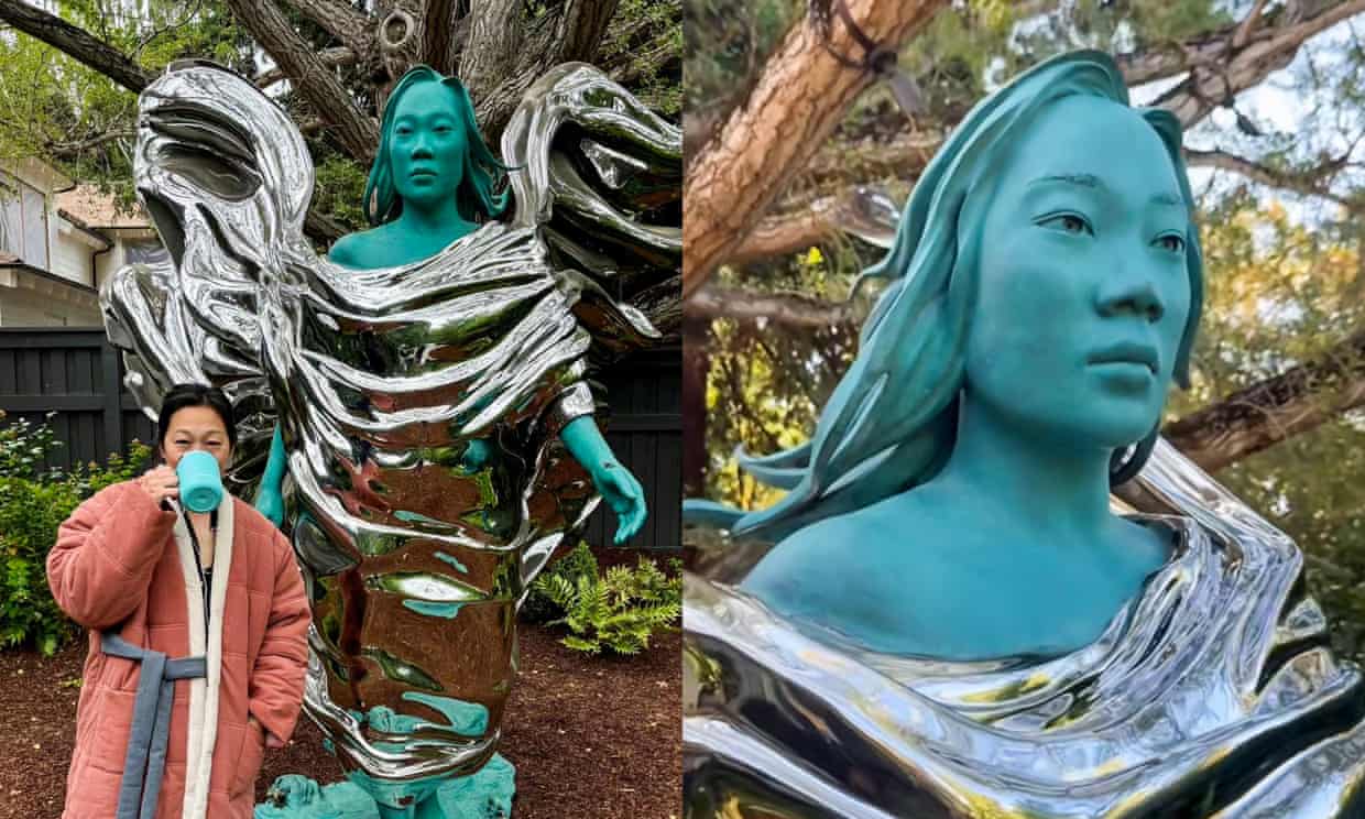 Trong ảnh, Chan diện bộ đồ ở nhà, tay cầm chiếc ly màu xanh, đứng kế bên bức tượng ước chừng cao hơn 2 m và thoải mái tạo dáng. Bà mẹ ba con dường như vừa ngủ dậy. Tóc cô được túm vội ra sau và đang nhâm nhi đồ uống từ một chiếc cốc màu xanh cùng màu bức tượng.