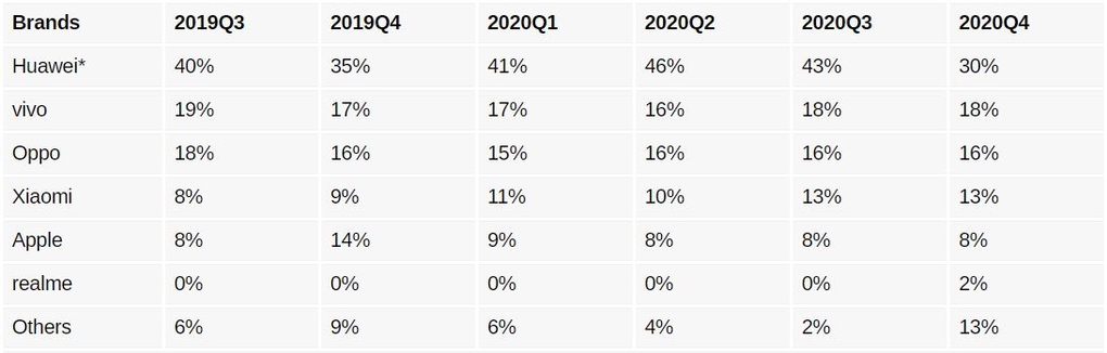 Trái ngược với Oppo, Huawei liên tục mất thị phần. Tình trạng thiếu linh kiện, lượng chip trong kho dần cạn kiệt khiến Huawei không thể tung ra nhiều sản phẩm 5G mới. Việc thiếu dịch vụ Google cũng khiến các mẫu máy 4G của hãng khó bán.