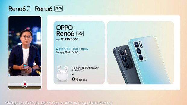 OPPO Reno6 5G và Reno6 Z 5G có mức giá lần lượt là 9.49 và 12.99 triệu đồng, cho phép đặt trước từ ngày 21/7 với bộ quà tặng lần lượt là tai nghe OPPO Enco Air và loa Bluetooth Tekin L6.