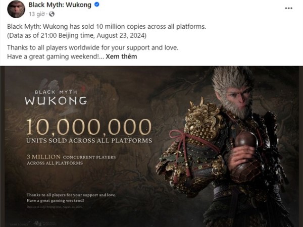 Nhà phát triển Game Science công bố Black Myth: Wukong đã bán được 10 triệu bản với 3 triệu người dùng chỉ trong 3 ngày, tính đến tối 23-8.