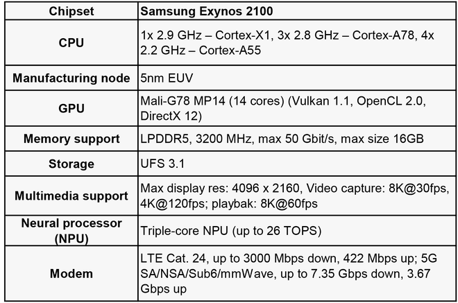 Mặc dù vậy, cũng không có nhiều thông số chi tiết về bộ xử lý này. Nhưng dựa vào cách đánh số của nó, có thể thấy hiệu năng của Exynos 9855 có nằm giữa Exynos 9840 (hay Exynos 2100 trên Galaxy S21) và Exynos 9925 (dự kiến sẽ xuất hiện trên Galaxy S22 với tên Exynos 2200 vào năm tới).