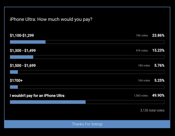 Theo đó, nếu iPhone Ultra đắt hơn mức giá 1.099 USD của iPhone 14 Pro Max, người tiêu dùng sẽ sẵn sàng trả bao nhiêu tiền cho nó? Cuộc khảo sát bắt đầu vào ngày 6/2 và nhanh chóng nhận được bình chọn từ 3.126 người tham gia. Thật bất ngờ khi kết quả khảo sát cho thấy “giá càng cao thì người tiêu dùng càng ít sẵn sàng chi trả”, thậm chí có tới xấp xỉ 50% người dùng cho biết sẽ không mua nó.