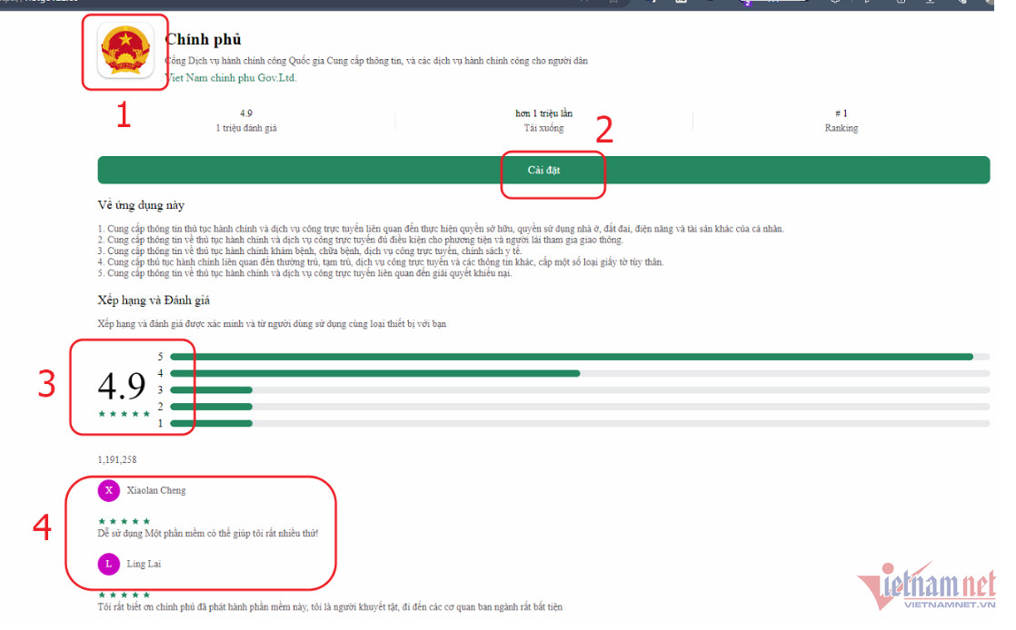 Thông tin thêm với VietNamNet, đại diện Cục An toàn thông tin chỉ ra một số đặc điểm nhận diện của website giả mạo lừa người dân cài đặt ứng dụng cài mã độc, đó là đối tượng làm giả logo của Chính phủ, giả mạo nút “Cài đặt” để điều hướng nạn nhân sang đường dẫn tải file “.apk” độc hại. Ngoài ra, các đối tượng còn giả mạo cả đánh giá, bình luận review nhận xét tốt về app cài mã độc.