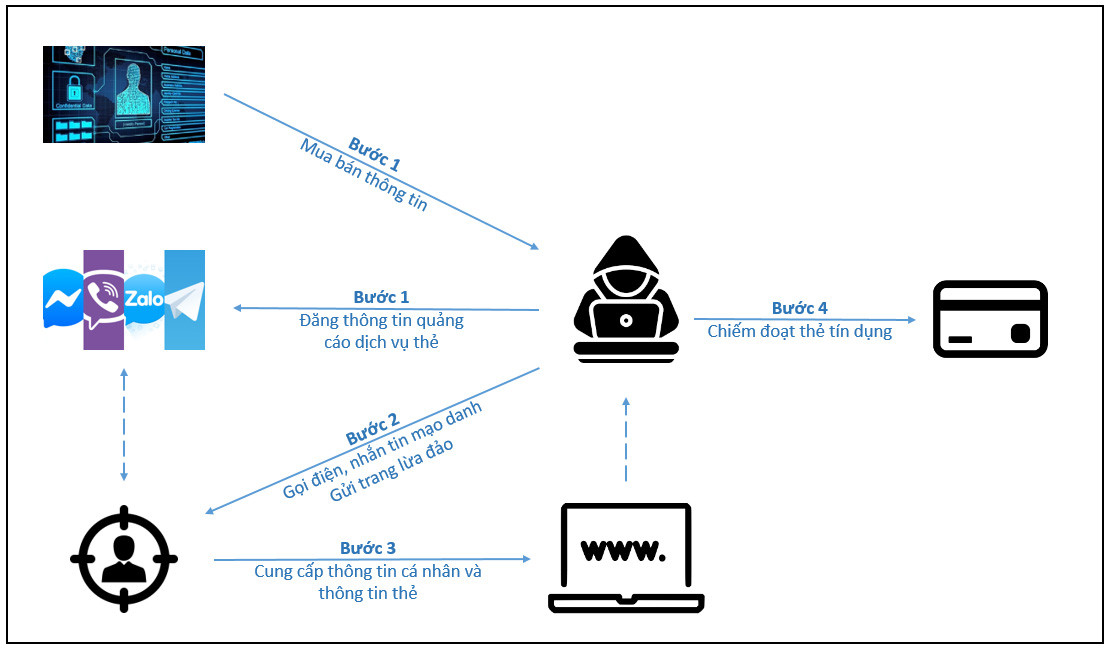 Kịch bản được các nhóm đối tượng đưa ra để lừa người dùng thẻ tín dụng khá tinh vi, với 4 bước. Trong đó, trước tiên, chúng tạo các bài đăng trên những trang mạng xã hội có nội dung hỗ trợ nâng cấp hạn mức thẻ tín dụng, sang ngang thẻ tín dụng… với lời mời gọi thủ tục nhanh chóng, duyệt hồ sơ siêu tốc, phê duyệt tự động, giải ngân trong ngày... Người dùng tin tưởng các bài đăng, sẽ liên hệ với các đối tượng. Ngoài ra, các đối tượng cũng có thể mua bán dữ liệu người dùng, trong đó bao gồm thông tin tin cá nhân, hạn mức thẻ tín dụng… để xác định những nạn nhân tiềm năng.
