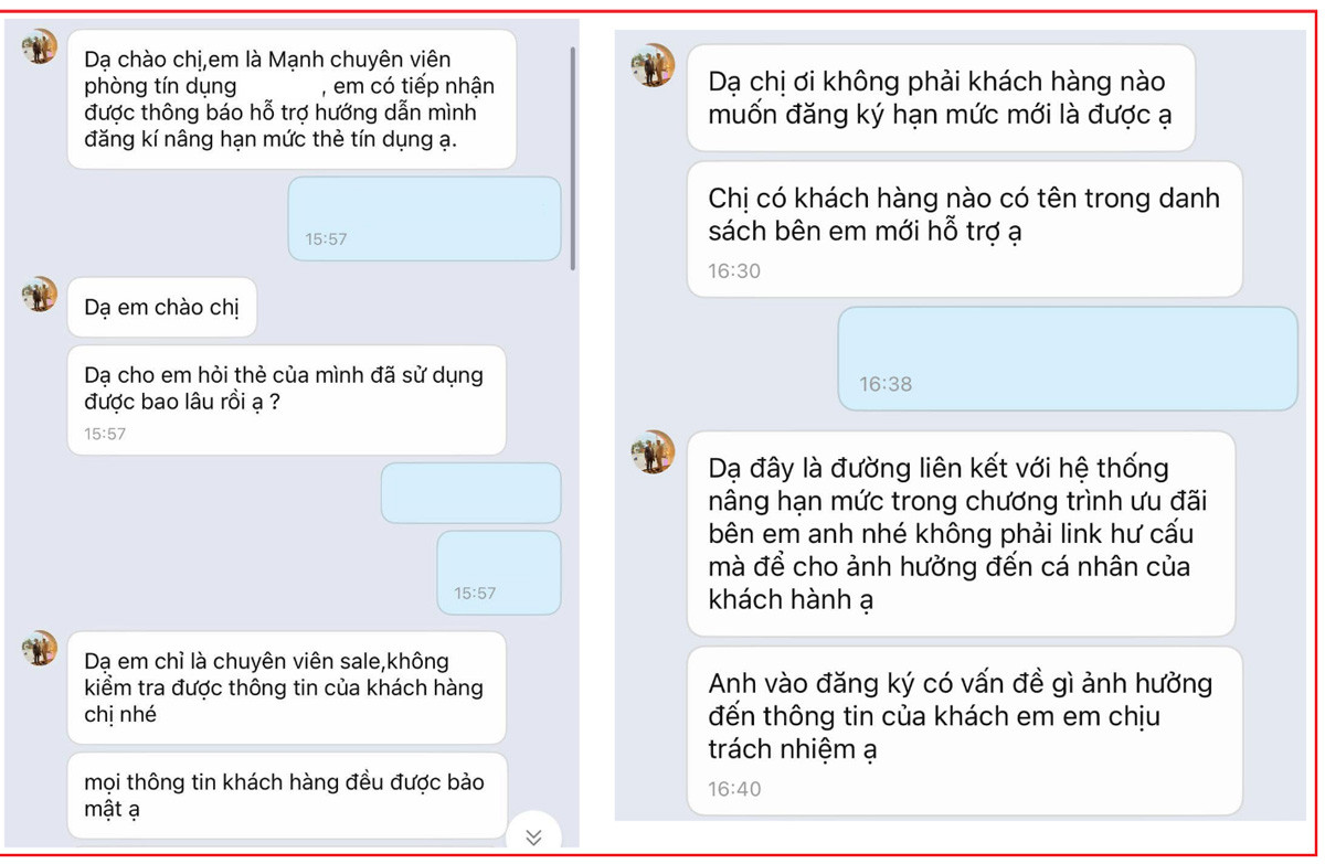 Tiếp theo, đối tượng gọi điện, nhắn tin cho người dùng và mạo danh là nhân viên của ngân hàng, tổ chức tài chính để gửi thông tin hỗ trợ, mời chào nạn nhân sử dụng các dịch vụ liên quan đến thẻ tín dụng.