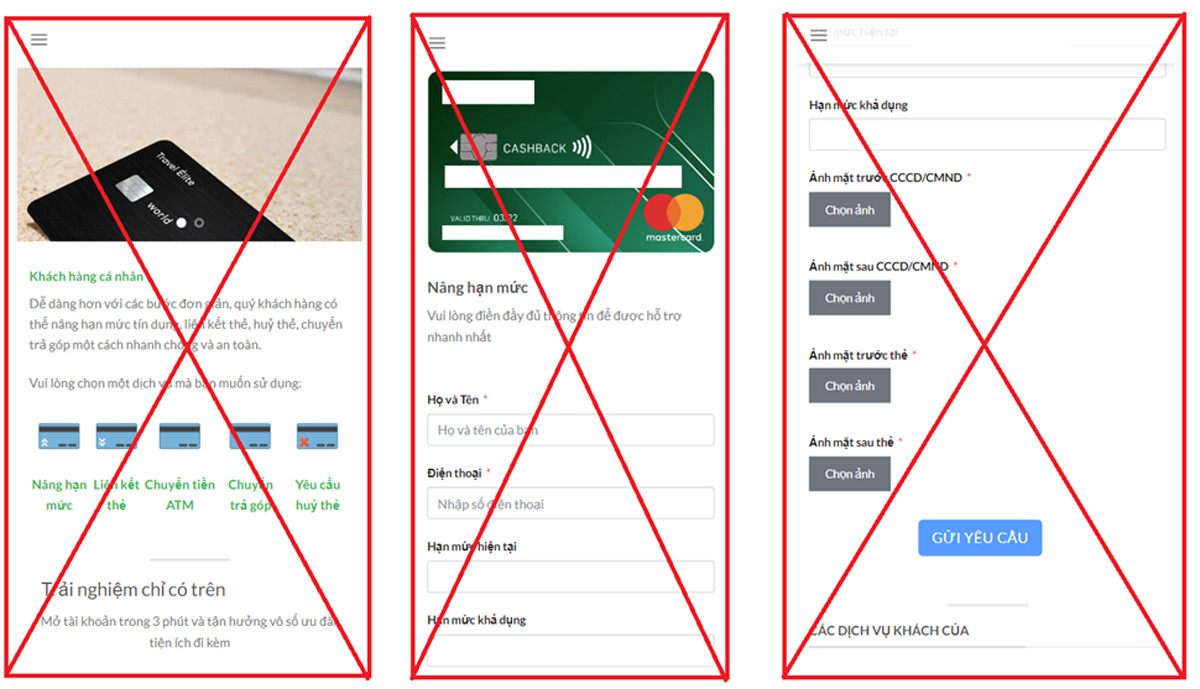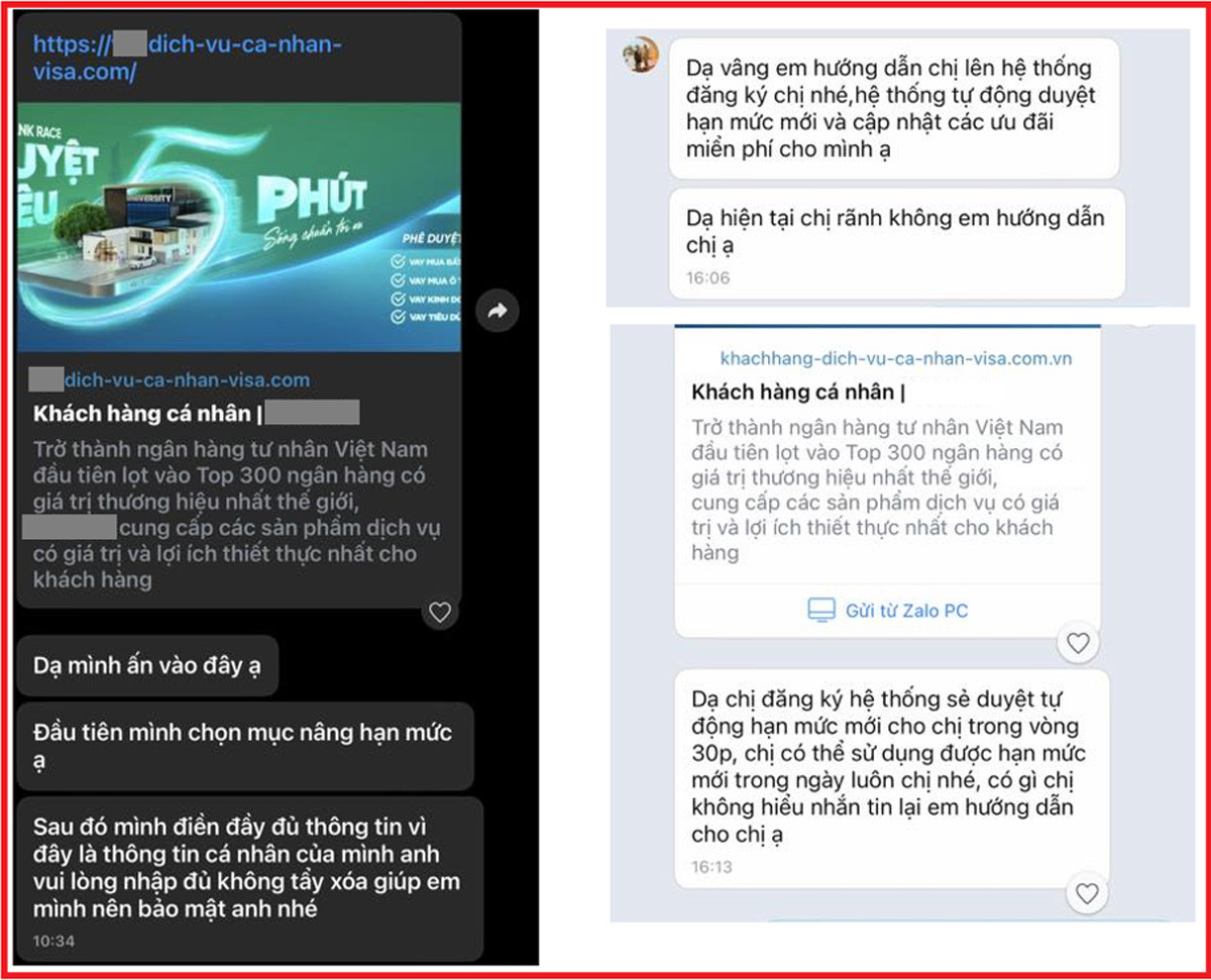 Sau đó, các đối tượng gửi đường link liên kết tới website giả mạo, lừa đảo. Trong một số trường hợp, đối tượng sử dụng các đường link rút gọn, hoặc cung cấp mã QR để nạn nhân quét. Một khi nạn nhân truy cập vào trang giả mạo, website sẽ yêu cầu cung cấp các thông tin cá nhân, thông tin thẻ tín dụng, bao gồm: họ tên, căn cước công dân, chụp ảnh căn cước công dân 2 mặt, số thẻ, mã bí mật CVV, ngày hết hạn thẻ giống như trang web chính thống của ngân hàng mục tiêu. Nạn nhân cũng được yêu cầu chia sẻ mã OTP gửi về số điện thoại.