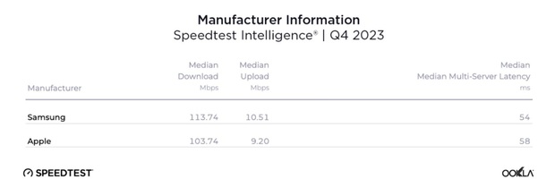 Mặc dù Apple có hai smartphone với tốc độ mạng nhanh nhất, Samsung vẫn có thể đánh bại Apple ở tốc độ di động trung bình tổng thể cao hơn ở thị trường Mỹ. Samsung đứng đầu về tốc độ download trung bình (113,74Mbps), tốc độ upload trung bình (10,51Mbps) và độ trễ (54 ms) so với tốc độ download trung bình 103,74Mbps của Apple, tốc độ upload trung bình là 9,20Mbps và độ trễ là 58 ms.