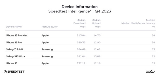 Theo dữ liệu phía trên từ Q3 2023, iPhone 15 Pro Max có tốc độ download trung bình là 251,37 Mbps ngay sau khi ra mắt và báo cáo mới này cho thấy tốc độ giảm xuống còn 213,84 Mbps sau một quý. Nhưng nhìn chung, đó là một mức tăng ấn tượng khi iPhone 14 Pro Max đạt tốc độ trung bình là 127,83 Mbps trong quý 2 năm 2023.