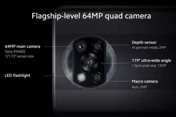 Cụm camera này của POCO X3 có thông số như sau: một camera góc rộng 64MP f/1.89 sử dụng cảm biến Sony IMX682, một camera góc siêu rộng 13MP góc nhìn 119 độ, một camera 2MP macro và một camera 2MP đo chiều sâu.