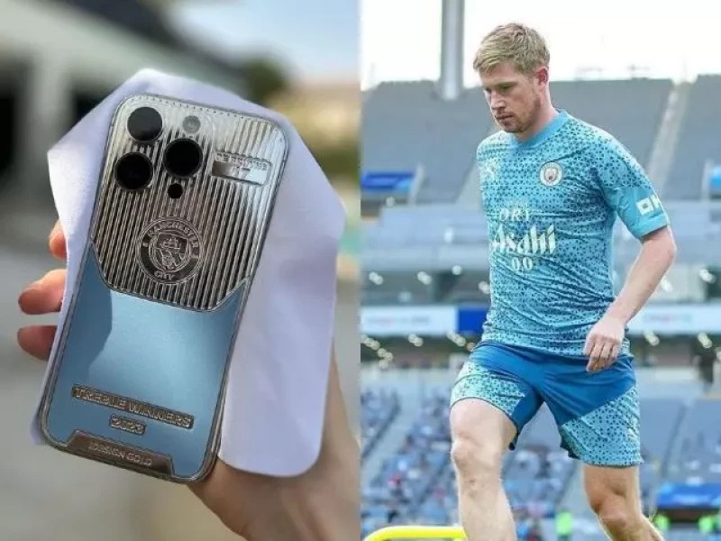 Được biết, đây là những chiếc iPhone 14 được custom lại bằng tên riêng của 26 thành viên của Man City bao gồm HLV Pep Guardiola cùng tất cả đồng đội. Chiếc iPhone này được thiết kế với khung làm bằng bạch kim và có cả logo của Man City.