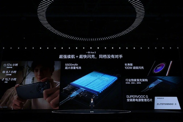 Điểm đáng chú ý nữa là dung lượng pin của OnePlus Ace 3 đạt mức "khủng" 5500mAh, kết hợp với công nghệ sạc nhanh SuperVOOC 100W sạc đầy pin từ 0% chỉ trong 27 phút. Đây hứa hẹn sẽ là một mẫu smartphone cho thời lượng sử dụng pin rất tốt.