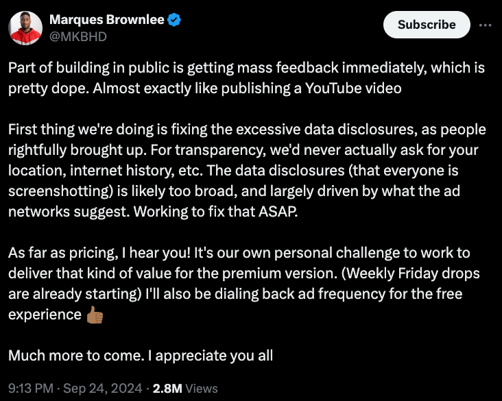 Đáp lại sự phản hồi này, Brownlee đã chia sẻ rằng anh rất coi trọng ý kiến của người dùng và gọi đó là "rất tuyệt vời". Anh cho biết nhóm đang làm việc để sửa chữa vấn đề liên quan đến việc tiết lộ dữ liệu quá mức và khẳng định rằng ứng dụng không thực sự thu thập thông tin cá nhân như vị trí hay lịch sử internet. Anh giải thích rằng sự nhầm lẫn này có thể do các đề xuất của mạng lưới quảng cáo và cam kết sẽ sửa chữa vấn đề này một cách nhanh chóng.