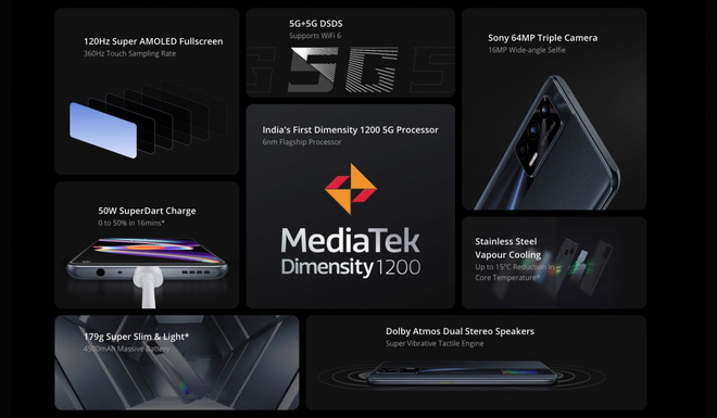 Về mặt hiệu năng, Realme trang bị cho chiếc smartphone của mình con chip Dimensity 1200 5G mạnh mẽ, RAM 8GB/12GB và bộ nhớ lưu trữ 128GB/256GB UFS 3.1. Máy có viên pin 4500mAh và hỗ trợ sạc nhanh 50W.