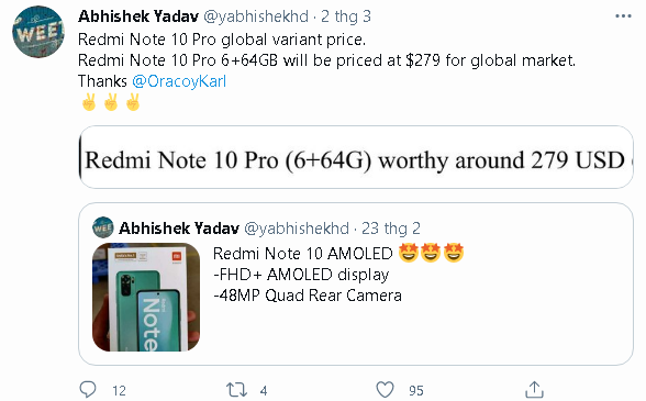 Thông tin đó chính là giá bản của phiên bản thấp nhất. Theo đó, Redmi Note 10 Pro phiên bản 6GB/64GB trên thị trường quốc tế có giá bán là 279 USD (khoảng 6,4 triệu đồng). Redmi Note 10 Pro cũng sẽ có các phiên bản 6GB/128GB và 8GB/128GB, nhưng giá bán chưa được tiết lộ.