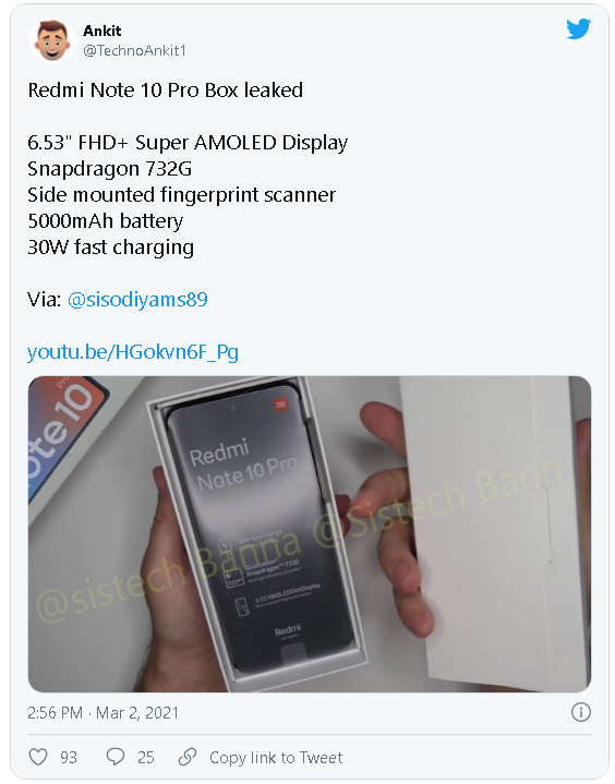 Hình ảnh vỏ hộp của Redmi Note 10 Pro cũng đã bị rò rỉ, cho chúng ta biết một vài thông số kỹ thuật cơ bản. Theo đó, Redmi Note 10 Pro được trang bị màn hình Super AMOLED 6,53 inch, chip xử lý Snapdragon 732G, pin 5.000 mAh và hỗ trợ sạc nhanh 30W.