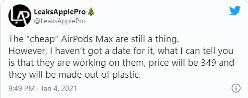 "Phiên bản thân thiện với mọi người của AirPods Max vẫn sẽ đến. Nhưng tôi chưa có tin tức chính xác về việc phát hành của nó. Nhưng điều tôi có thể nói với bạn là chúng đang được phát triển và giá khoảng 349 USD. Và nó sẽ được làm bằng nhựa.", tài khoản này chia sẻ. @LeaksApplePro là người thường hé lộ sớm các tin tức liên quan đến kế hoạch của Apple trong quá khứ.