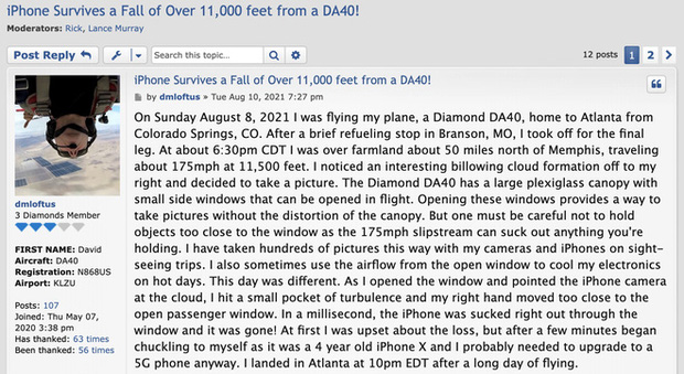 Cụ thể, câu chuyện của David được anh chia sẻ trên diễn đàn Diamond Aviators (diễn đàn dành cho các phi công sử dụng máy bay của Diamond). Anh cho biết khi đang điều khiển chiếc máy bay có mã hiệu Diamond DA40 bay từ Colorado Springs tới Atlanta, anh đã cố gắng lấy chiếc iPhone X ra để chụp ảnh đám mây phía bên phải thông qua cửa sổ nhỏ ở cạnh của máy bay. David giải thích rằng cửa sổ nhỏ bên cạnh chiếc Diamond DA40 có thể được mở ra trong khi bay và cho phép chụp ảnh mà không bị vướng tấm chắn cửa sổ.