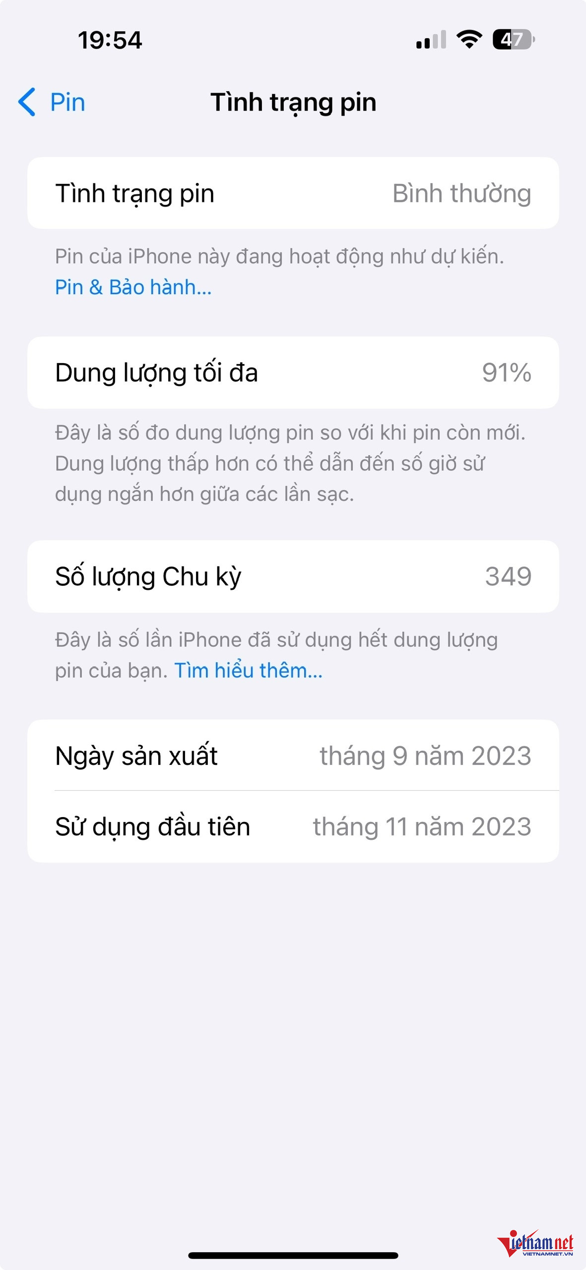 Muốn biết tình trạng pin iPhone hiện nay, độc giả vào Cài đặt > Pin > Tình trạng pin. Tại đây, Apple sẽ cung cấp thông tin về tình trạng pin, dung lượng tối đa (dung lượng pin so với khi pin còn mới), số lượng chu kỳ sạc, ngày sản xuất và lần sử dụng đầu tiên.